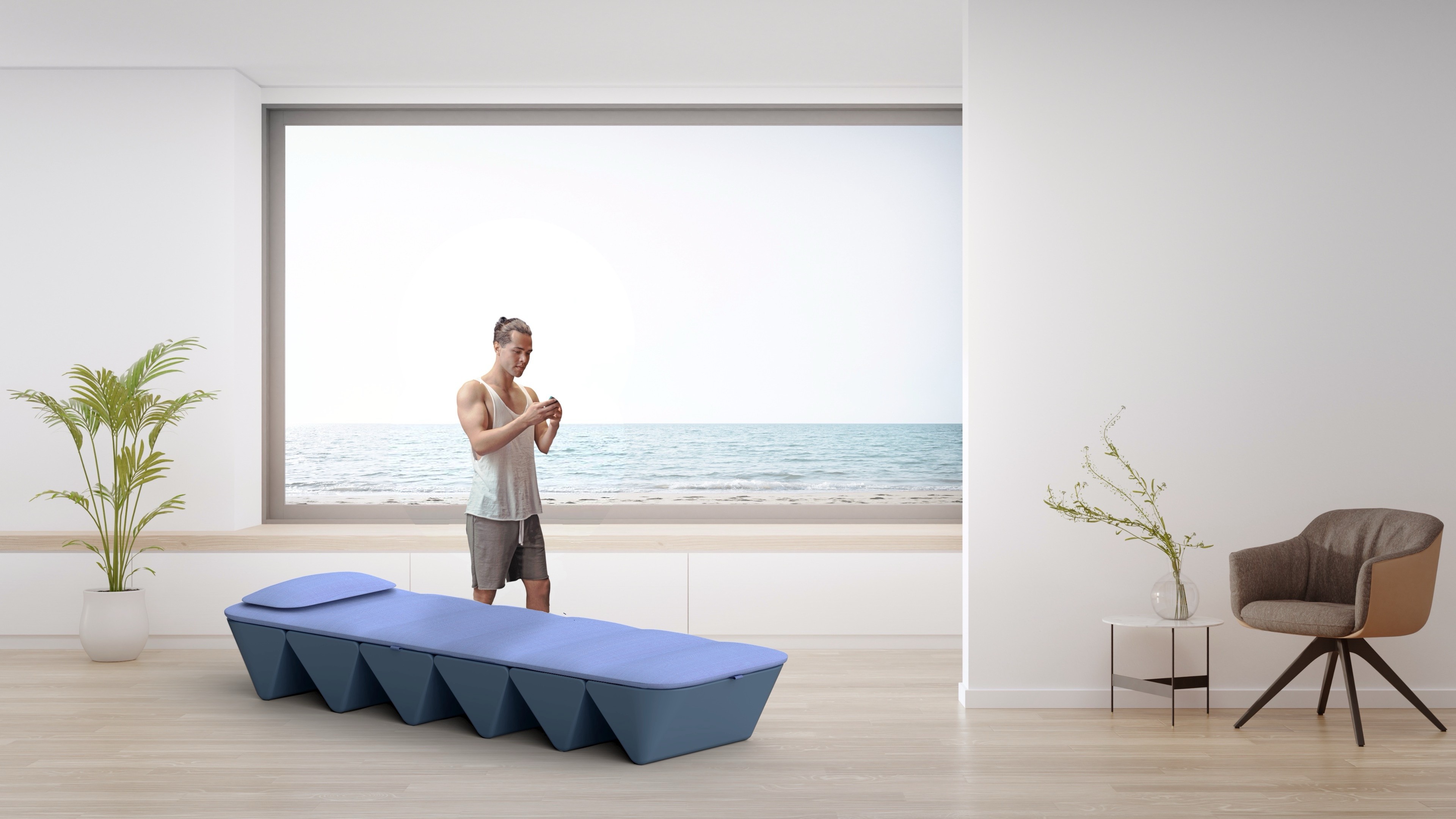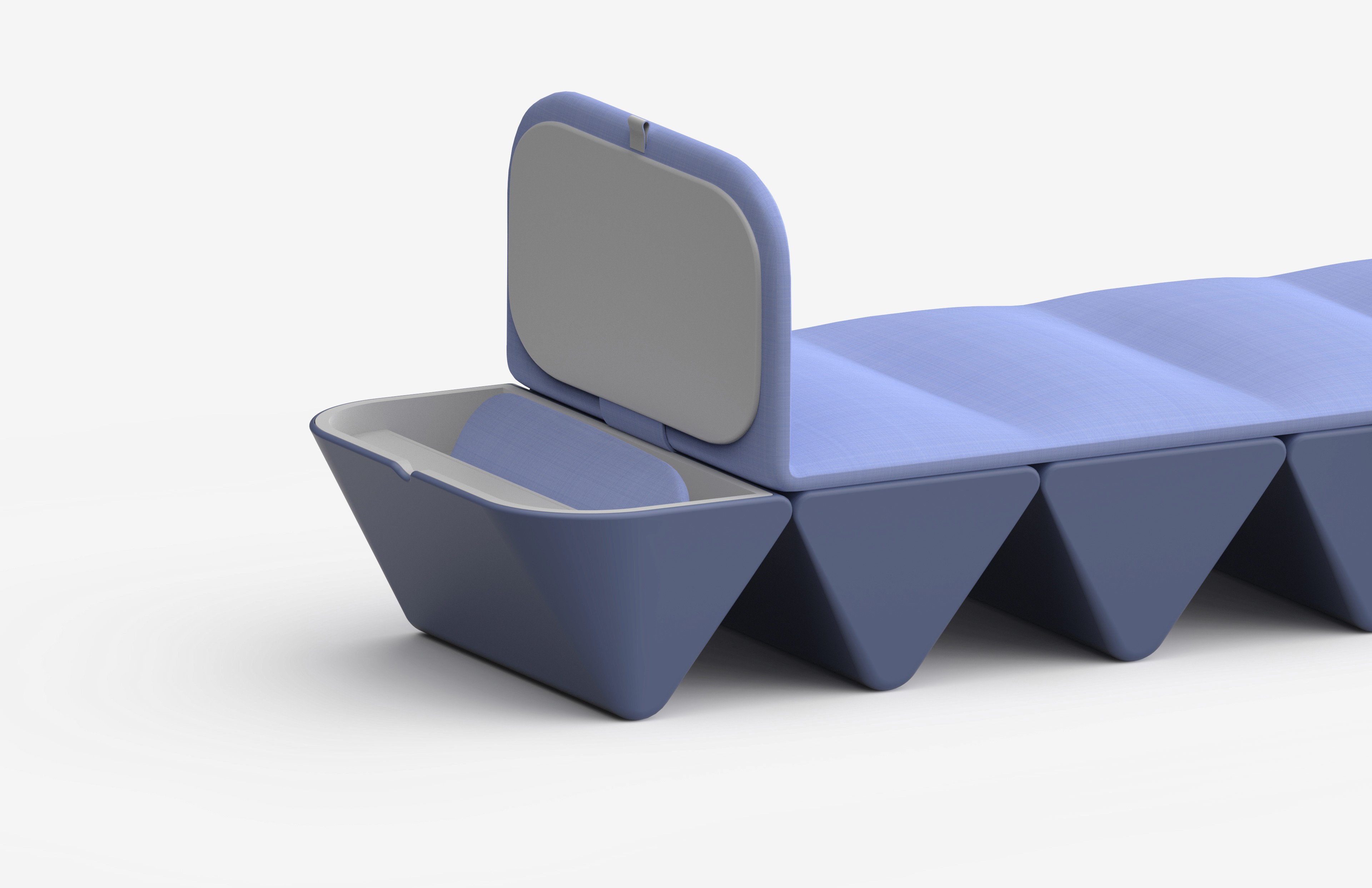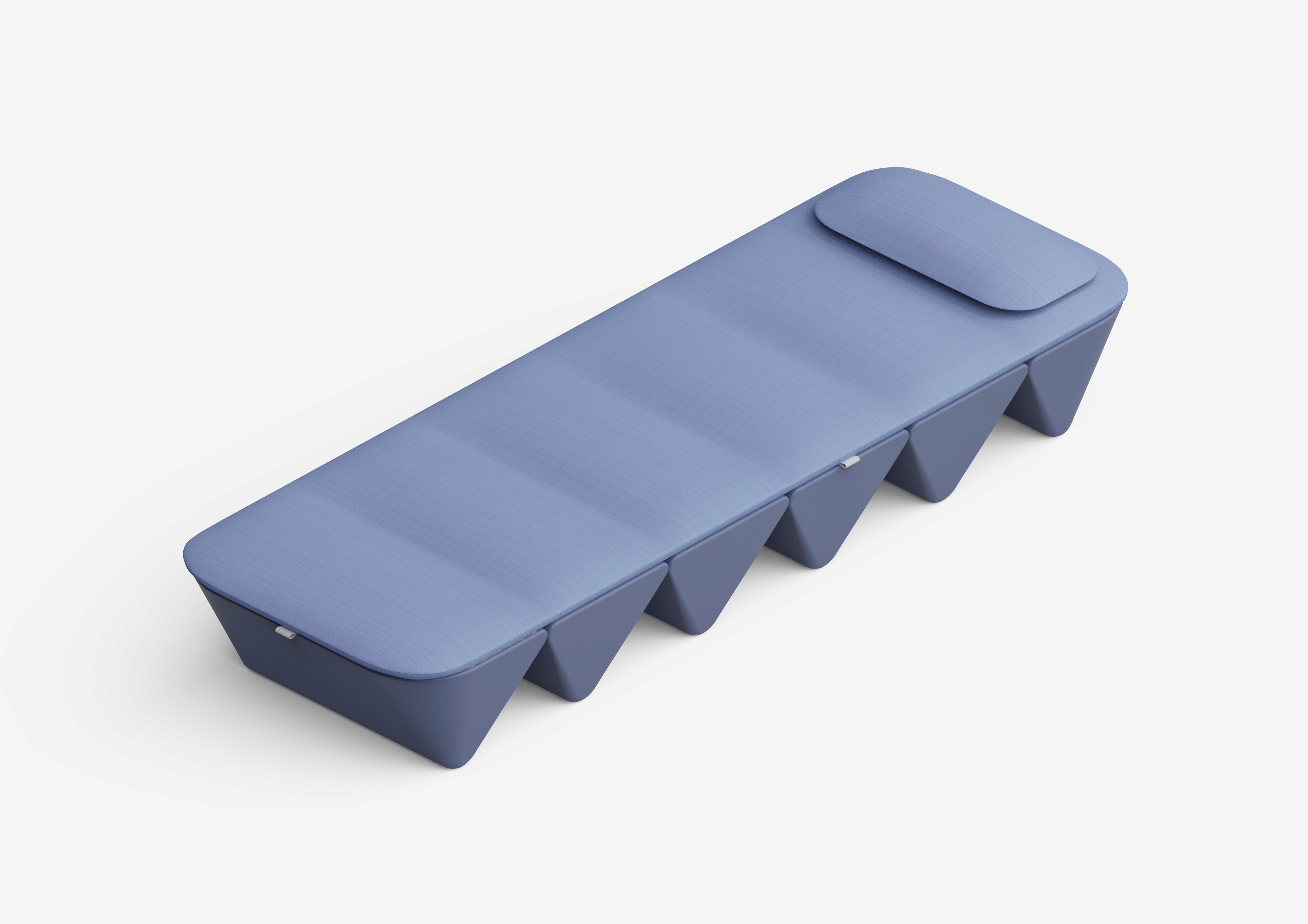 This is a portable massage bed designed as a single, cohesive form rather than a collection of parts. Its faceted structure enables the bed to fold into a compact volume, embedding support directly into the geometry. The result is a design that transitions from a sculptural object in storage to a stable, full-length surface in use.